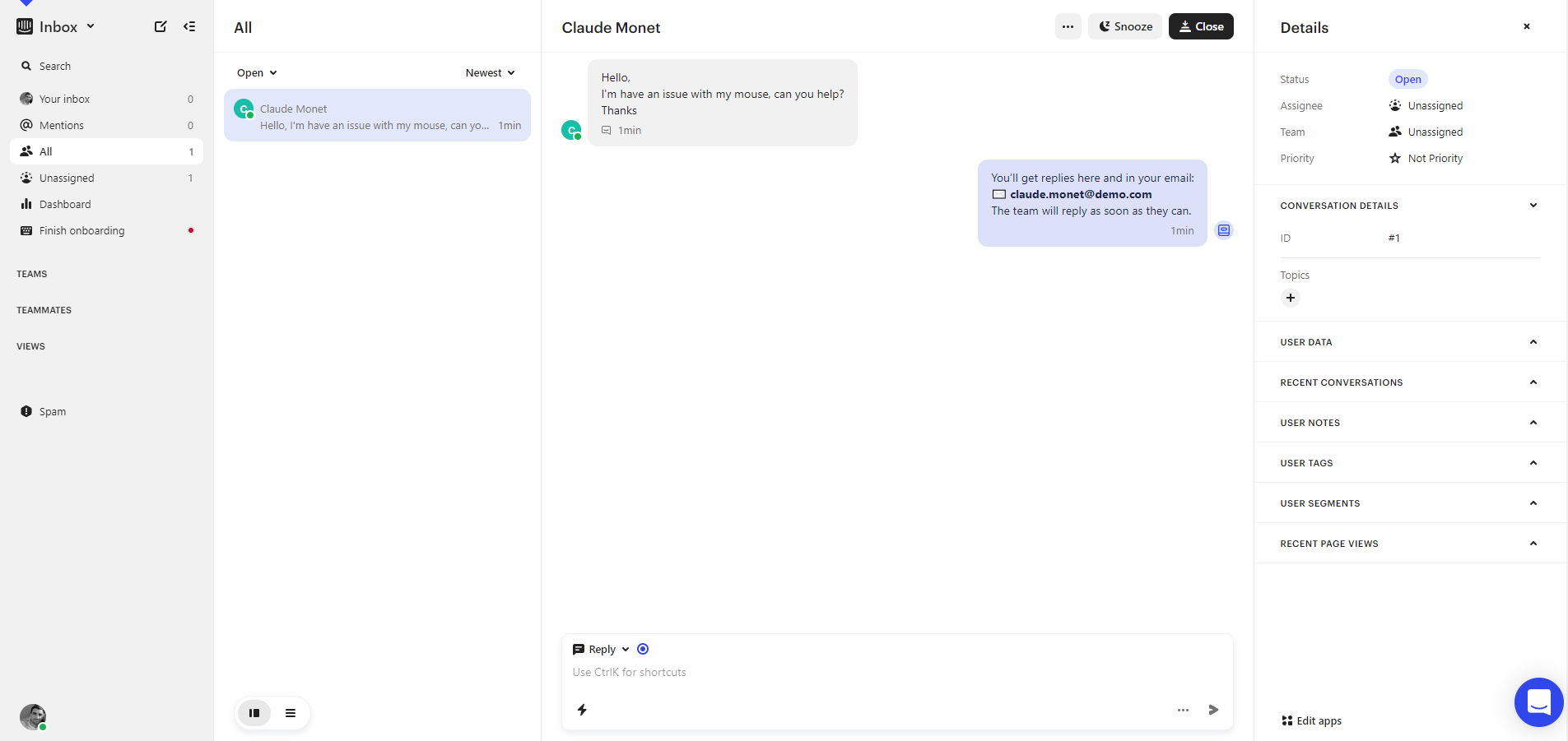 Support agents can reply through the Intercom dashboard, and optionally create a corresponding ticket within iTop, see following section.