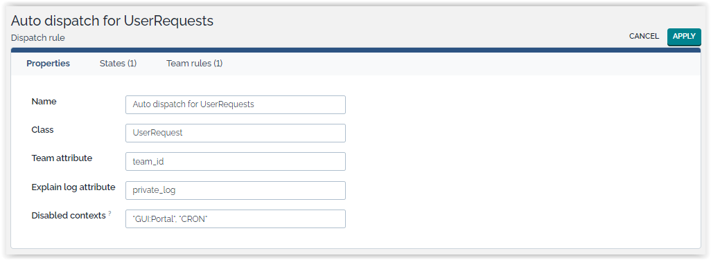A dispatch rule is defined for one Class of Ticket. It must contain at least one Team rule and one State rule.