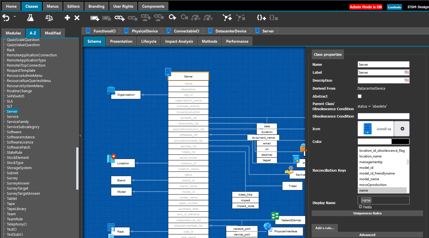 At this point, if you look at the schema of the MySQL database, you can see the additional “notes” column added to the “server” table. However if you navigate to a Server in iTop, nothing has changed.