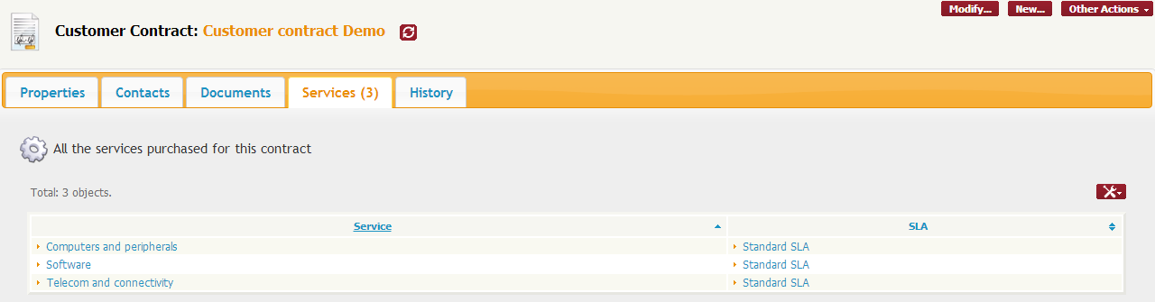A customer contract allows you to define which services have been purchased (requested) by a customer and what are the SLA corresponding to those services. By default, no coverage window is defined in iTop.