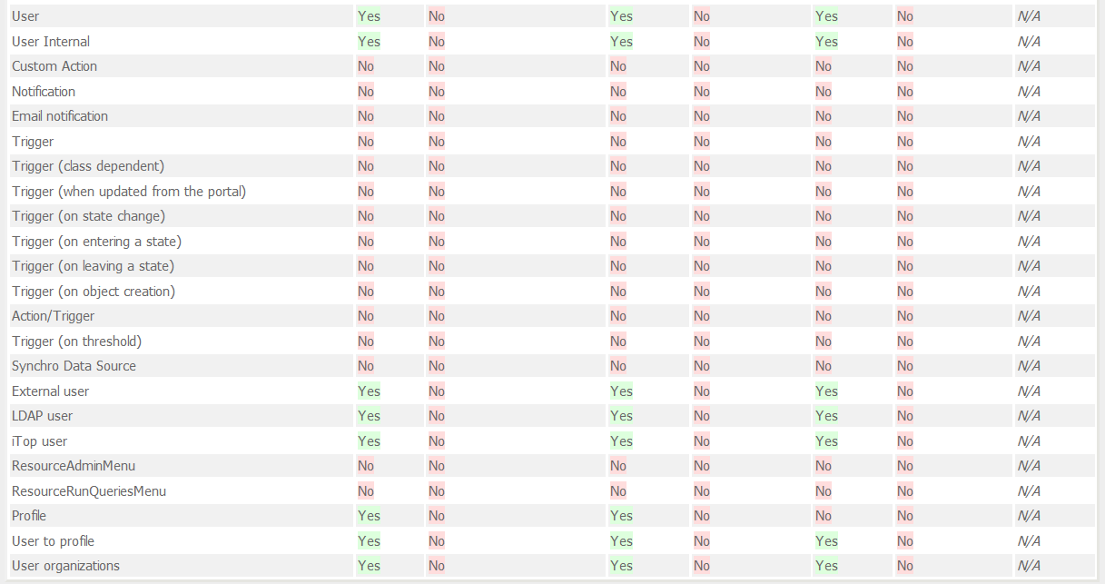 <user_rights> <group id="Notification" _delta="define"> <classes> <!-- This class list is also present in AdminTools group --> <class id="Trigger"/> <class id="lnkTriggerAction"/> <class id="Action"/> <class id="ResourceRunQueriesMenu"/> </classes> </group> <group id="User"> <classes> <!-- This class list is also present in AdminTools group --> <class id="User"/> <class id="URP_UserOrg"/> <class id="URP_UserProfile"/> <class id="URP_Profiles"/> </classes> </group> <group id="Audit"> <classes> <!-- This class list is also present in AdminTools group --> <class id="AuditCategory"/> <class id="AuditRule"/> <class id="ResourceRunQueriesMenu"/> </classes> </group> <group id="Query"> <classes> <!-- This class list is also present in AdminTools group --> <class id="Query"/> <class id="QueryOQL"/> <class id="ResourceRunQueriesMenu"/> </classes> </group> <group id="SynchroData"> <classes> <!-- This class list is also present in AdminTools group --> <class id="SynchroDataSource"/> <class id="SynchroAttribute"/> </classes> </group> </user_rights> </itop_design>