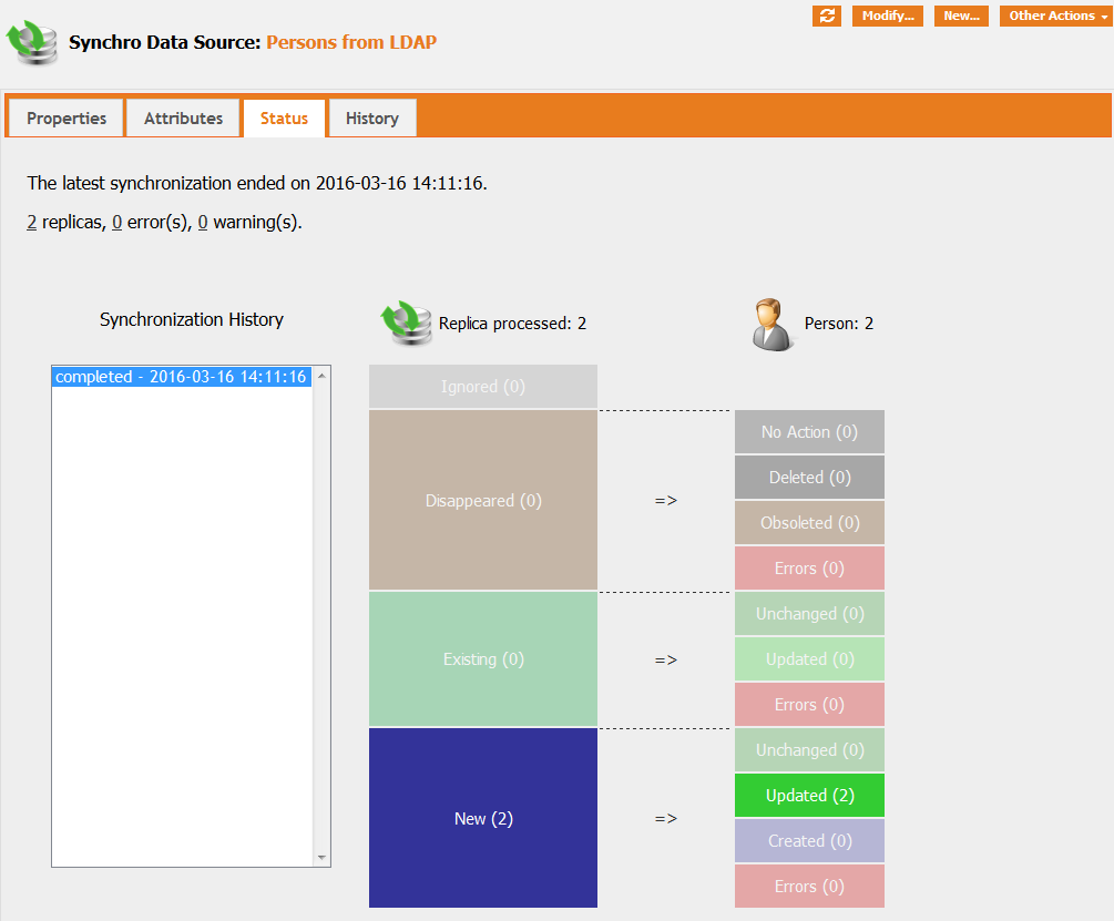 #Load-------------- #------------------ #Data Source: 1 #Synchronize: 1 #Class: Person #Separator: ; #Qualifier: " #Charset Encoding:UTF-8 #Date format: <none> #Data Size: 228 #Data Lines: 2 #Columns: primary_key, name, first_name, org_id, email, status, function, phone, notify #Output format: summary #Simulate: 0 #Change tracking comment: #Issues (before synchro): 0 #Created (before synchro): 2 #Updated (before synchro): 0 #Synchronization--- #------------------ #Replicas: 2 #Replicas touched since last synchro: 2 #Objects deleted: 0 #Objects deletion errors: 0 #Objects obsoleted: 0 #Objects obsolescence errors: 0 #Objects created: 0 (0 warnings) #Objects creation errors: 0 #Objects updated: 0 (0 warnings) #Objects update errors: 0 #Objects reconciled (updated): 2 (0 warnings) #Objects reconciled (unchanged): 0 (0 warnings) #Objects reconciliation errors: 0 #Replica disappeared, no action taken: 0