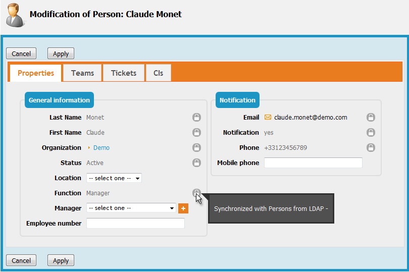 Then modify the text file “persons.csv” in the directory “data” under the root of iTop, by fixing the last line at the end (replace Test by Demo):