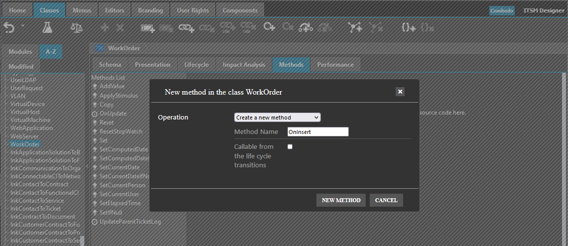 If you want to achieve this, you can define the OnUpdate() function on the WorkOrder class on top of the OnInsert().