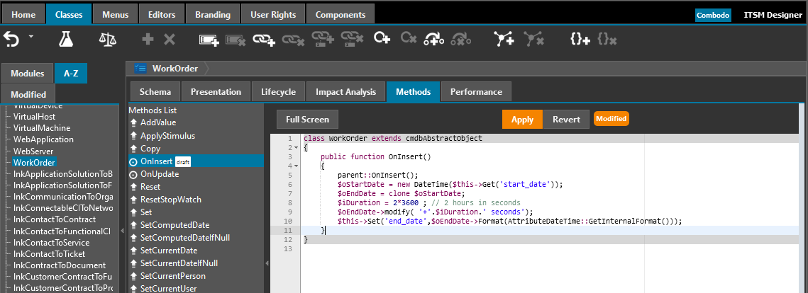 In this usecase, we want to automatically compute the end date of a WorkOrder to its start date + a fixed delay of 2 hours.