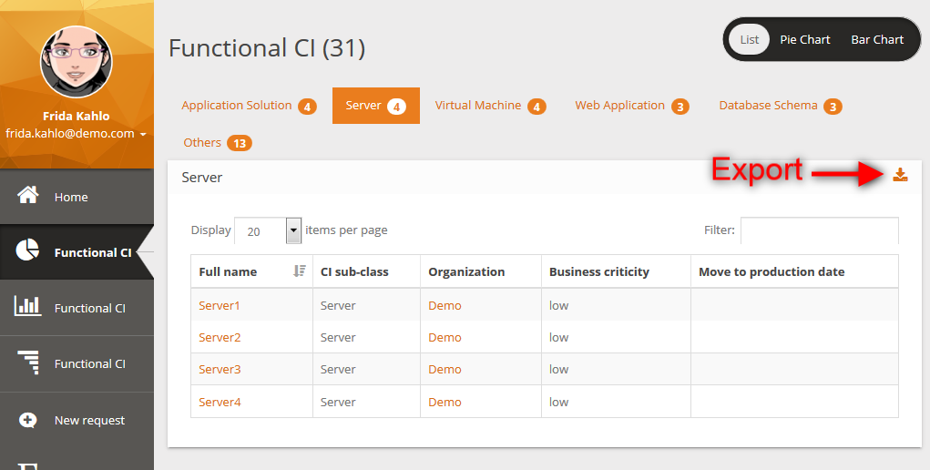 <?xml version="1.0" encoding="UTF-8"?> <itop_design xmlns:xsi="http://www.w3.org/2001/XMLSchema-instance" version="1.0"> <module_designs> <module_design id="itop-portal" xsi:type="portal"> <bricks> <brick id="ongoing-tickets-for-portal-user-ext" xsi:type="Combodo\iTop\Portal\Brick\ManageBrick" _delta="define"> <active>true</active> <rank> <default>20</default> </rank> <width>6</width> <title> <default>Brick:Portal:OngoingRequests:Title</default> </title> <description>Brick:Portal:OngoingRequests:Title+</description> <decoration_class> <default>fa fa-etsy fa-2x</default> </decoration_class> <oql><![CDATA[SELECT Ticket]]></oql> <!-- Optional tag to define if the action should be done in a modal window ("modal"), a new window ("new") or the current window ("self") --> <!--<opening_target>modal</opening_target>--> <!-- Optional tag to define the how the objects should be opened. Values can be edit|view. Note that even if this is set to edit, objects not allowed in edition mode for the user (cf. scopes and security layers) will open in view mode --> <!-- <opening_mode>edit</opening_mode> --> <!-- Can be either a class tag with the class name or an oql tag with the query --> <!-- <class>Ticket</class> --> <!-- Optional tag to add attributes to the table by their code --> <fields> <field id="title"/> <field id="start_date"/> <field id="status"/> <field id="service_id"/> <field id="servicesubcategory_id"/> <field id="priority"/> <field id="caller_id"/> </fields> <!-- Optional: display type can be 'pie-chart', 'bar-chart', 'list' --> <display_modes> <!-- How the data can be displayed in the ManageBrick --> <availables> <mode id="list"/> <mode id="pie-chart"/> <mode id="bar-chart"/> </availables> <!-- How the ManageBrick get displayed by default when open --> <default>pie-chart</default> <!-- How the ManageBrick is displayed in the Homepage and in an AggregatePageBrick --> <!-- Possible values are text|badge|pie-chart|bar-chart|top-list --> <tile>badge</tile> </display_modes> <!-- Optional: way to define the export to Excel --> <export> <!-- Optional tag to export attributes by their code --> <fields> <field id="title"/> <field id="start_date"/> <field id="status"/> <field id="service_id"/> <field id="servicesubcategory_id"/> <field id="priority"/> <field id="caller_id"/> <field id="description"/> </fields> <!-- Optional way to tell that the export uses default fields --> <!-- <export_default_fields>true</export_default_fields> --> </export> <grouping> <!-- Mandatory --> <tabs> <!-- Optional. Show object count for each tabs. Available values are true|false. Default is false. --> <show_tab_counts>true</show_tab_counts> <!-- Mandatory. Grouping by tabs --> <!--<attribute>operational_status</attribute>--> <!-- attribute xor groups tag --> <!-- Optional way to limit the number of groups when grouping with attribute --> <!-- <limit>5</limit> --> <!-- Optional when limit given, display the aggregation of the remaining groups --> <!-- <show_others>true</show_others> --> <groups> <!-- Can be used only with ../oql tag, not ../class tag. Reason is that we can't know the class alias to apply to the condition's fields. We might have an exception saying that the field in ambigious for the generated query. --> <group id="opened"> <rank>1</rank> <title>Brick:Portal:OngoingRequests:Tab:OnGoing</title> <condition><![CDATA[SELECT Ticket AS T WHERE operational_status NOT IN ('closed', 'resolved')]]></condition> </group> <group id="resolved"> <rank>2</rank> <title>Brick:Portal:OngoingRequests:Tab:Resolved</title> <condition><![CDATA[SELECT Ticket AS T WHERE operational_status = 'resolved']]></condition> </group> </groups> </tabs> <!-- Implicit grouping on y axis by finalclass --> </grouping> <data_loading>full</data_loading> </brick> </bricks> </module_design> </module_designs> </itop_design>