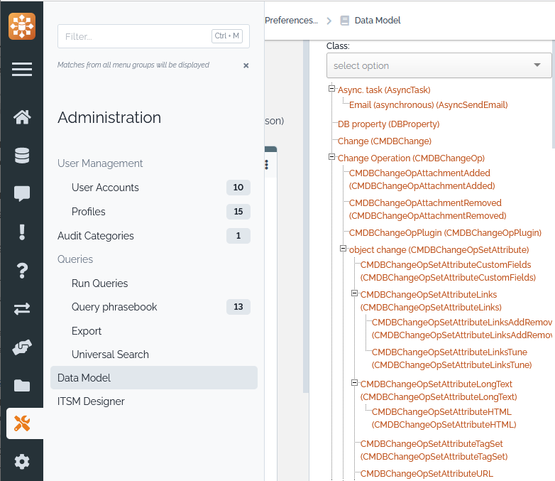 Depending on the modules installed during the setup, the data model of iTop (also called the objects schema) can vary. You can view the current data model used by iTop by clicking on the link “Data Model” in the “Admin Tools” menu.