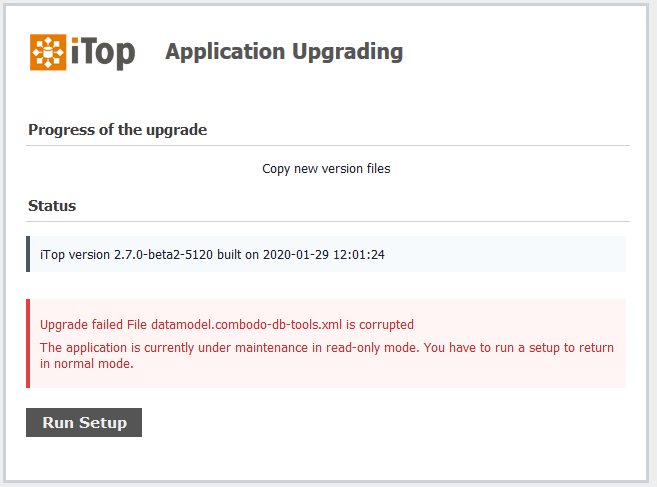 Answer: If the upgrade process crashes in the middle, the <itop>/data/.readonly and <itop>/data/.maintenance files might need to be removed manually. A successful Setup remove automatically those files after a failed Application upgrade.