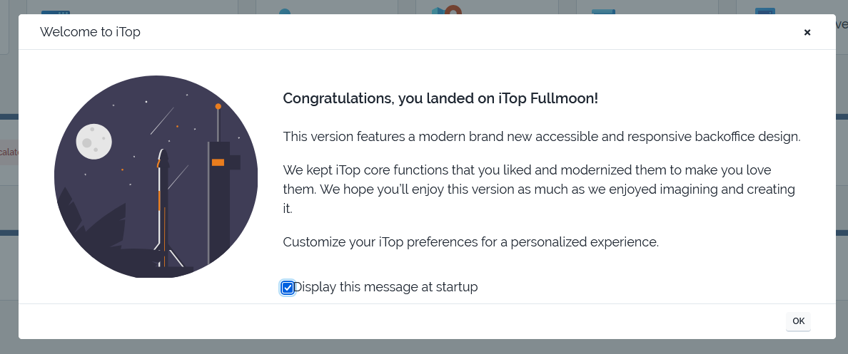 Once authenticated, the user accesses the main iTop page. The first time a user connects the Welcome to iTop popup is displayed. This popup can be removed for the next time by un-checking “Display this message at startup”.