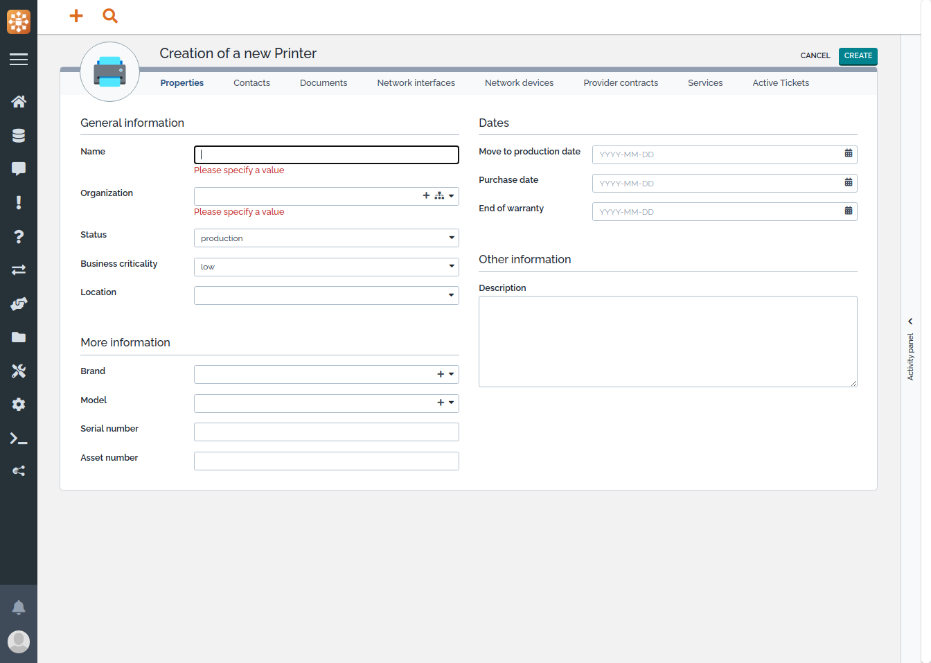 • Impacts: a Printer impacts the Application Solutions that this Printer is part of and all the contacts (Persons, Teams) directly linked to the Printer.