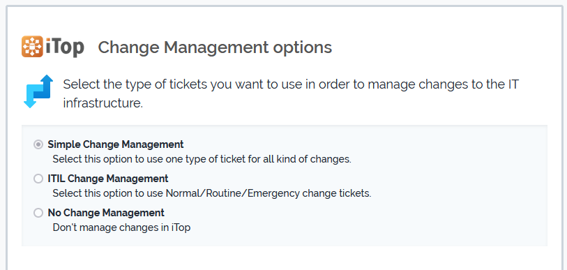You can also completely deactivate the Change Management in iTop by selecting the third choice.