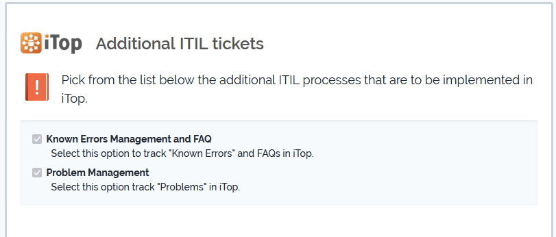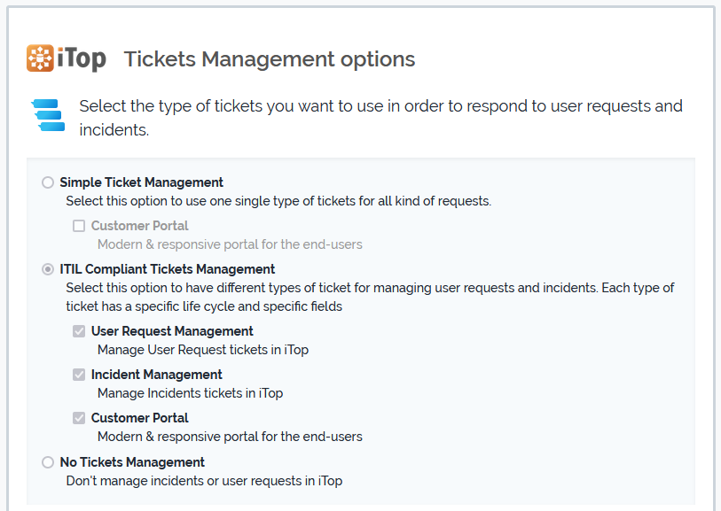 In addition to change and incident management, two other type of ITIL compliant processes can be deployed by selecting the corresponding type of tickets: