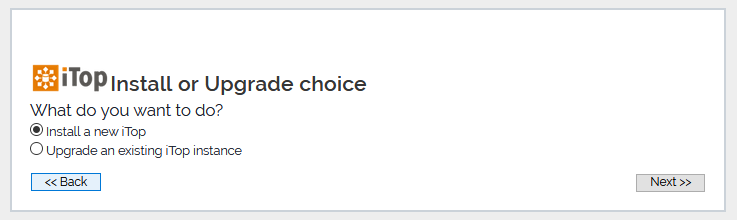 The second step of the installation offers the choice to either upgrade an existing iTop or to install the application from scratch.