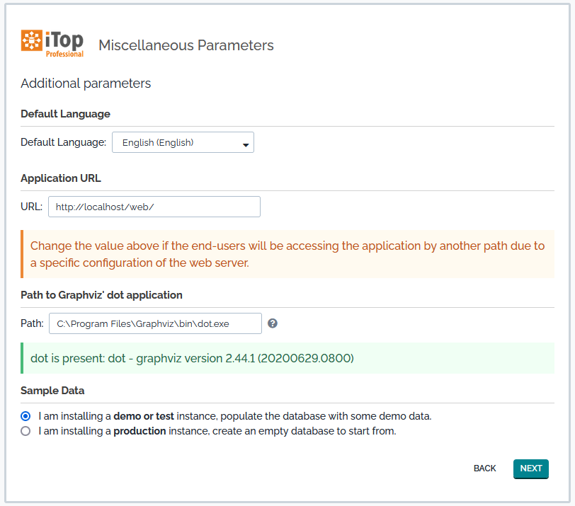 • sample data: install sample data if you want to quickly experiment with iTop. Sample data provide some sample configuration items (servers, applications, contacts) and default settings for the service catalog in order to ensure a quick deployment of the application. Do not select this option if you are deploying a production instance of iTop and want a “clean” installation.