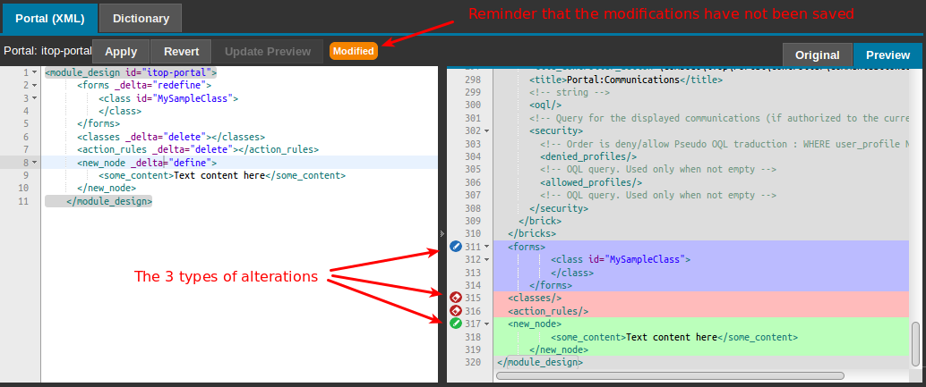 This tab displays - side by side - the XML alteration to the portal configuration (on the left) and either the original XML or the resulting XML (on the right).