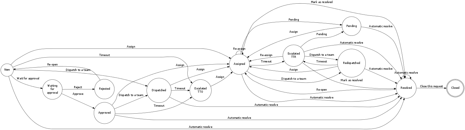| New | Assigned | Dispatched | Waiting for approval | Escalated TTO | Resolved | Pending | Escalated TTR | Redispatched | Closed | Approved | Rejected | |