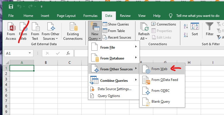 To use this query in Excel, click on the button From Web in the Excel tab Data