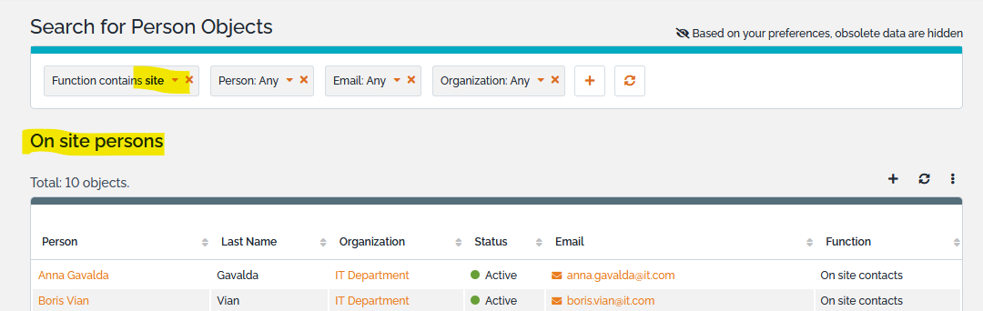 For example, imagine that you want to have an easy access to all persons tagged as “On-Site Contact”. Search for contacts having site in their function: