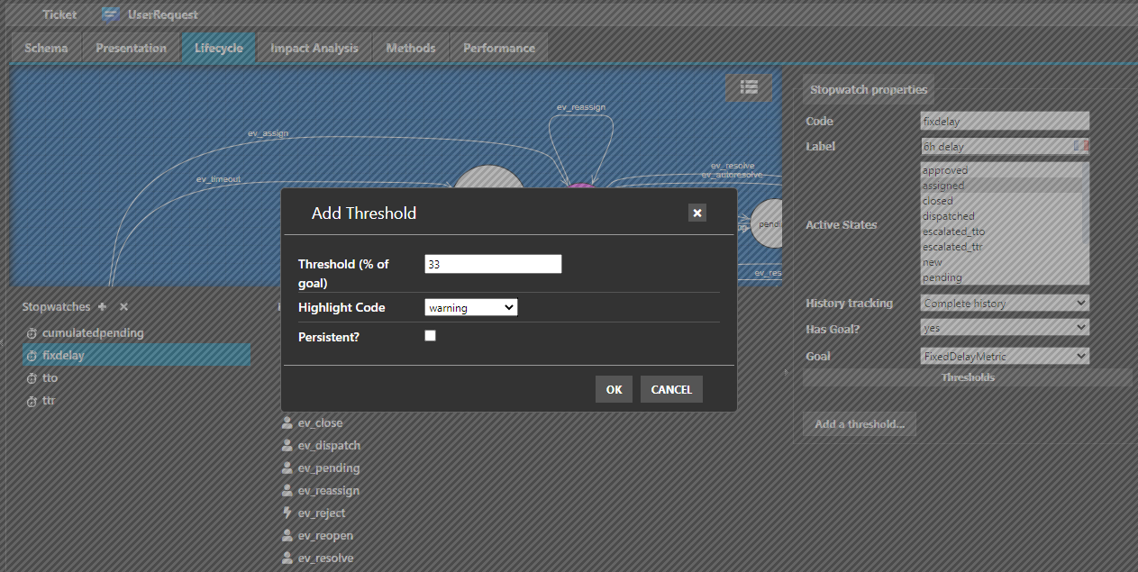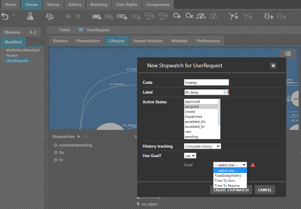 Add a stopwatch attribute on UserRequest class, to count when the ticket is in “assigned” state, with a fixed goal, defined in a configuration parameter.