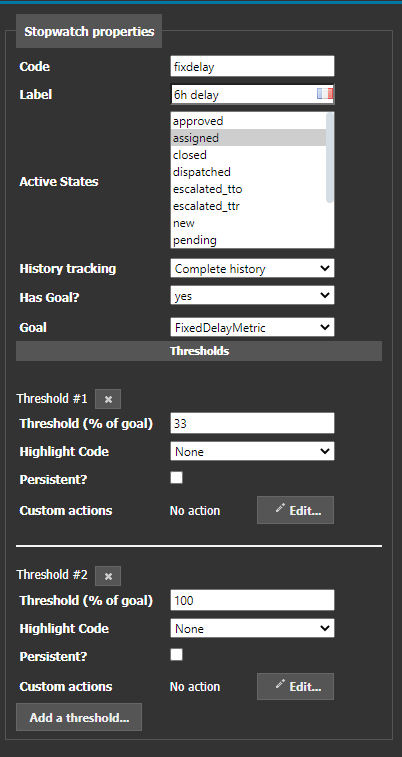 <!-- Add a stopwatch to count the timespent in this state --> <field id="fixdelay" xsi:type="AttributeStopWatch" _delta="define"> <states> <!-- here are the states during which the stopwatch is counting time --> <state id="assigned">assigned</state> </states> <!-- here we decided to count time regardless of the working hours --> <working_time>DefaultWorkingTimeComputer</working_time> <thresholds/> <goal>FixedDelayMetric</goal> <always_load_in_tables>true</always_load_in_tables> </field>