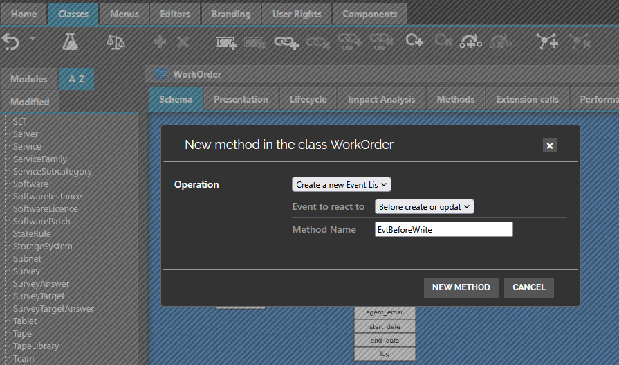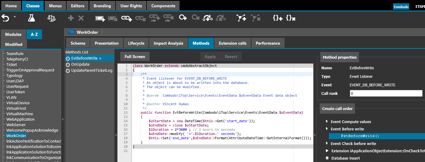 <class id="WorkOrder"> <event_listeners> <event_listener id="EvtBeforeWrite" _delta="define"> <!-- Id of the event does not have to be the same as the callback method, but why not --> <event>EVENT_DB_BEFORE_WRITE</event> <rank>10</rank> <callback>EvtBeforeWrite</callback> <!-- The callback must be the name of an existing class method. The name is free. Signature is imposed --> </event_listener> </event_listeners>