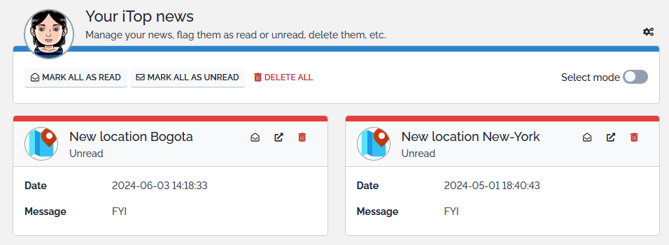 iTop Community Administrators will receive news from 2 different News publisher. The label below the right icon of each message, provides the origin of the message (iTop Hub, iTop or other News publisher).