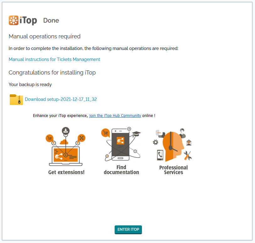 Once the installation is done, you can: Review the instructions about setting up the background tasks, by clicking the link “Manual instructions for Tickets Management”. Or enter iTop immediately by clicking on the “Enter iTop” button.