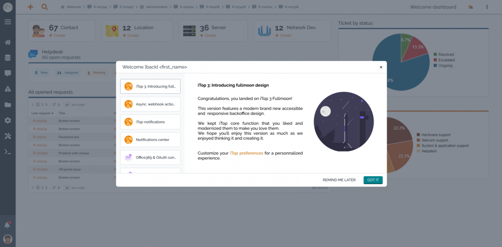 Since this version, iTop is a News provider, which means he can send News to targeted users, when something is occurring in iTop.