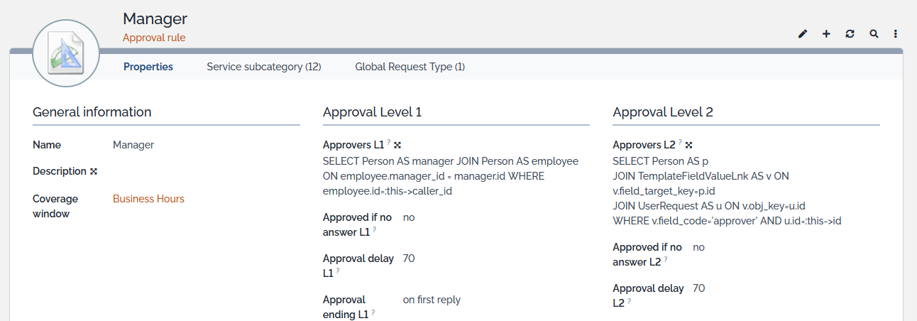 | 2015-09-30 | 1.1.3 | Disable the standard attributes UserRequest::approver_id and approver_email, as they do not make sense when this module is installed. Removed the âplusâ button from the Approval Rule edition form, to workaround a bug in the coverage windows creation form (when shown as a dialog, requires a fix in the core of iTop, related to the component âSLA With Coverage Windowsâ version >=2.1.0, or the module âcombodo-coverage-windows-computation>=2.0.0) |