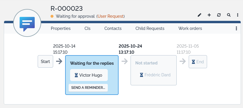 Click on the button âsend a reminderâ to send a new message to the approver (confirmation required). This feature can be disabled by setting the parameter enable_reminder to false.
