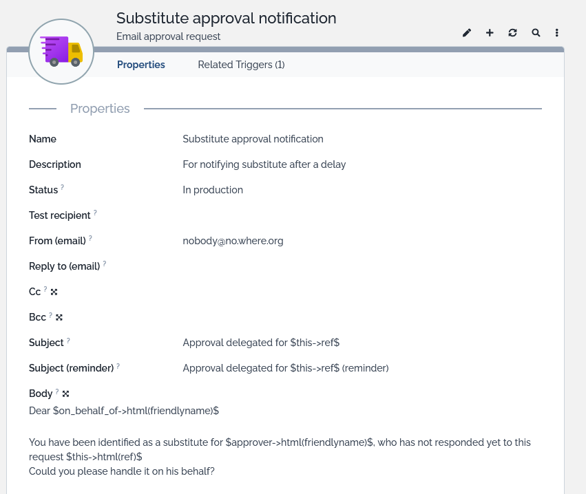 Substitute L1 = "SELECT Person WHERE id=:approver->id" Substitute notification delay L1 = 50%