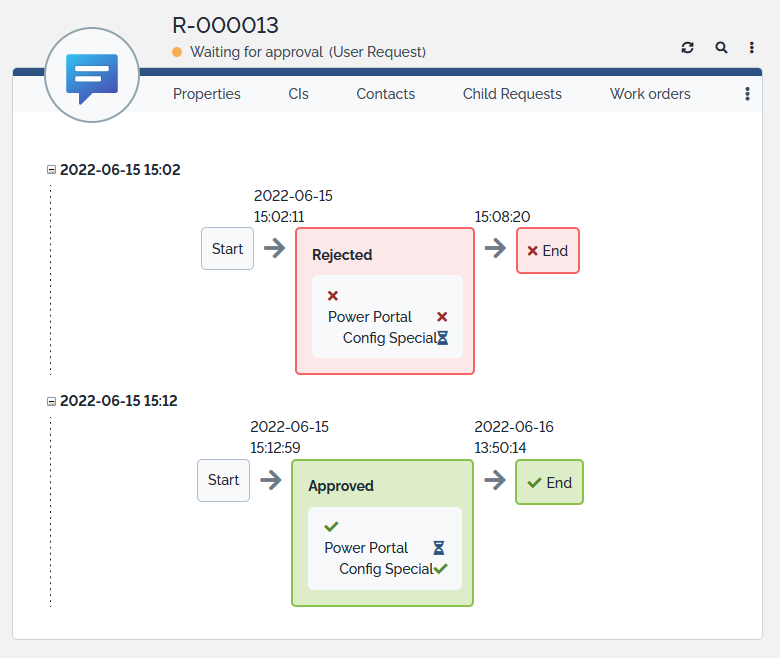 As soon as a user request has been through an approval process, the tab Approval status shows detailed information about the ongoing or terminated approval.