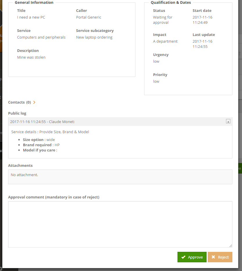 Approvers can approve or reject a request in one click from an email (no need to have an iTop account) or multiple requests pending for their approval in Console or Portal.