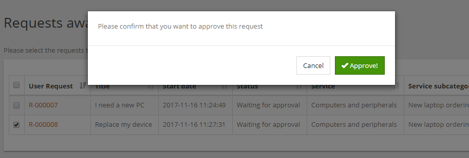 The page shows a list of the User Requests having an approval process running, and for which your approval is being requested: