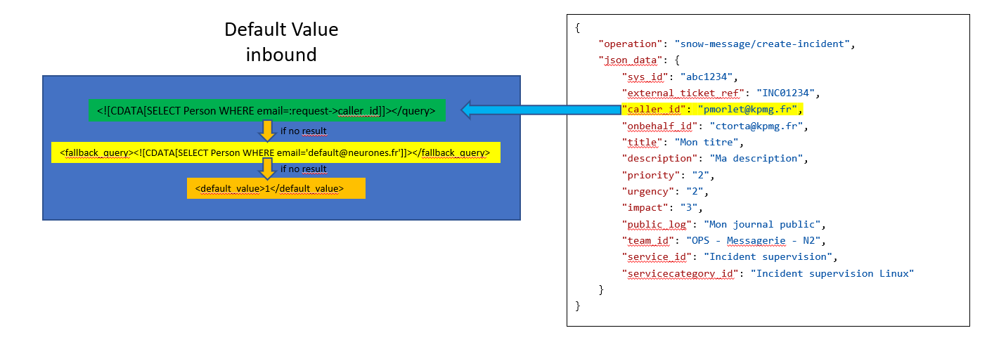 <module_design id="case-exchange" _delta="must_exist"> <remote_applications> <remote_application id="DefaultCEXRemoteiTop" xsi:type="CEXRemoteiTop" _delta="define"> <global> <inbound> <operations> <operation id="itop-message/hand-shake" xsi:type="Combodo\iTop\Extension\CEXiTop\Service\CEXIncomingMessageHandShake"/> <operation id="itop-message/add-attachment" xsi:type="Combodo\iTop\Extension\CEXSDK\Incoming\Message\AddAttachment"/> <operation id="itop-message/del-attachment" xsi:type="Combodo\iTop\Extension\CEXSDK\Incoming\Message\DelAttachment"/> </operations> </inbound> </global> <synchronized_classes> <synchronized_class id="UserRequest"> <inbound> <global_mapping> <object_attributes> <!-- How the local synchronized object attributes are mapped from the received message fields --> <attribute id="agent_id" xsi:type="Combodo\iTop\Extension\CEXSDK\Mapping\ByOQL"> <query><![CDATA[SELECT Person WHERE email=:remote->agent_id AND email != '']]></query> <args> <arg id="remote->agent_id"> <remote_field id="agent_id"/> <description>Agent email</description> </arg> </args> </attribute> <attribute id="caller_id" xsi:type="Combodo\iTop\Extension\CEXSDK\Mapping\ByOQL"> <query><![CDATA[SELECT Person WHERE email=:remote->caller_id AND email != '']]></query> <fallback_query><![CDATA[SELECT Person WHERE email='claude.monet@demo.com']]></fallback_query> <args> <arg id="remote->caller_id"> <remote_field id="caller_id"/> <description>Caller email</description> </arg> </args> </attribute> <attribute id="description" xsi:type="Combodo\iTop\Extension\CEXSDK\Mapping\ByRemoteField">description</attribute> <attribute id="escalation_flag" xsi:type="Combodo\iTop\Extension\CEXSDK\Mapping\ByRemoteField">escalation_flag</attribute> <attribute id="escalation_reason" xsi:type="Combodo\iTop\Extension\CEXSDK\Mapping\ByRemoteField">escalation_reason</attribute> <attribute id="impact" xsi:type="Combodo\iTop\Extension\CEXSDK\Mapping\ByMatrix"> <remote_field id="impact"/> <description>Impact value: 1, 2 or 3</description> <values> <value id="1">3</value> <value id="2">2</value> <value id="3">1</value> </values> </attribute> <attribute id="org_id" xsi:type="Combodo\iTop\Extension\CEXSDK\Mapping\ByOQL"> <query><![CDATA[SELECT Organization WHERE name=:remote->org_id]]></query> <args> <arg id="remote->org_id"> <remote_field id="org_id"/> <description>Organization name</description> </arg> </args> </attribute> <attribute id="origin" xsi:type="Combodo\iTop\Extension\CEXSDK\Mapping\ByRemoteField"> <remote_field id="origin"/> <description>call origin (phone,...)</description> </attribute> <attribute id="parent_request_id" xsi:type="Combodo\iTop\Extension\CEXSDK\Mapping\ByOQL"> <query><![CDATA[SELECT UserRequest WHERE remote_ref=:remote->parent_request_id AND remote_ref != '']]></query> <args> <arg id="remote->parent_request_id"> <remote_field id="parent_request_id"/> <description>Parent ticket reference</description> </arg> </args> </attribute> <attribute id="pending_reason" xsi:type="Combodo\iTop\Extension\CEXSDK\Mapping\ByRemoteField">pending_reason</attribute> <attribute id="private_log" xsi:type="Combodo\iTop\Extension\CEXSDK\Mapping\ByRemoteField">private_log</attribute> <attribute id="public_log" xsi:type="Combodo\iTop\Extension\CEXSDK\Mapping\ByRemoteField">public_log</attribute> <attribute id="remote_ref" xsi:type="Combodo\iTop\Extension\CEXSDK\Mapping\ByRemoteField">ref</attribute> <attribute id="request_type" xsi:type="Combodo\iTop\Extension\CEXSDK\Mapping\ByRemoteField">request_type</attribute> <attribute id="resolution_code" xsi:type="Combodo\iTop\Extension\CEXSDK\Mapping\ByRemoteField">resolution_code</attribute> <attribute id="service_id" xsi:type="Combodo\iTop\Extension\CEXSDK\Mapping\ByOQL"> <query><![CDATA[SELECT Service WHERE name=:remote->service_id]]></query> <args> <arg id="remote->service_id"> <remote_field id="service_id"/> <description>Service name</description> </arg> </args> </attribute> <attribute id="servicesubcategory_id" xsi:type="Combodo\iTop\Extension\CEXSDK\Mapping\ByOQL"> <query><![CDATA[SELECT ServiceSubcategory WHERE name=:remote->servicesubcategory_id]]></query> <args> <arg id="remote->servicesubcategory_id"> <remote_field id="servicesubcategory_id"/> <description>Service sub-category name</description> </arg> </args> </attribute> <attribute id="solution" xsi:type="Combodo\iTop\Extension\CEXSDK\Mapping\ByRemoteField">solution</attribute> <attribute id="team_id" xsi:type="Combodo\iTop\Extension\CEXSDK\Mapping\ByOQL"> <query><![CDATA[SELECT Team WHERE name=:remote->team_id]]></query> <args> <arg id="remote->team_id"> <remote_field id="team_id"/> <description>Team name</description> </arg> </args> </attribute> <attribute id="title" xsi:type="Combodo\iTop\Extension\CEXSDK\Mapping\ByRemoteField">title</attribute> <attribute id="urgency" xsi:type="Combodo\iTop\Extension\CEXSDK\Mapping\ByMatrix"> <remote_field id="urgency"/> <description>Urgency level: 1 to 4</description> <values> <value id="1">1</value> <value id="2">2</value> <value id="3">3</value> <value id="4">4</value> </values> </attribute> <attribute id="user_satisfaction" xsi:type="Combodo\iTop\Extension\CEXSDK\Mapping\ByRemoteField">user_satisfaction</attribute> <attribute id="user_comment" xsi:type="Combodo\iTop\Extension\CEXSDK\Mapping\ByRemoteField">user_comment</attribute> </object_attributes> <link_attributes> <!-- How the local to remote link attributes are mapped from the received message fields --> <attribute id="source_key" xsi:type="Combodo\iTop\Extension\CEXSDK\Mapping\ByRemoteField">source_key</attribute> <attribute id="source_fname" xsi:type="Combodo\iTop\Extension\CEXSDK\Mapping\ByRemoteField">source_fname</attribute> <attribute id="source_class" xsi:type="Combodo\iTop\Extension\CEXSDK\Mapping\ByConstant">UserRequest</attribute> </link_attributes> <remote_fields> <!-- How the fields for the response to the remote system are mapped from the local synchronized object --> <field id="agent_id" xsi:type="Combodo\iTop\Extension\CEXSDK