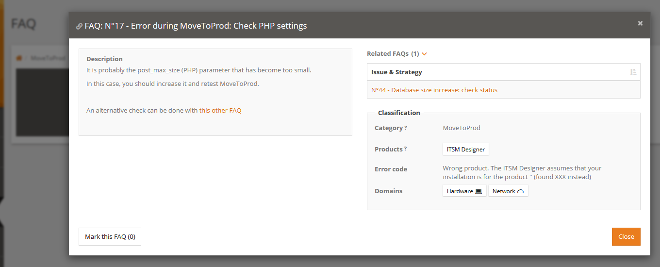 Allow a agent to tag a Ticket as candidate for writing a FAQ documenting the issue of the Ticket (User Request, Incident, Change, Problem). The action of creating a FAQ based on a User Request is part of the Problem Management.