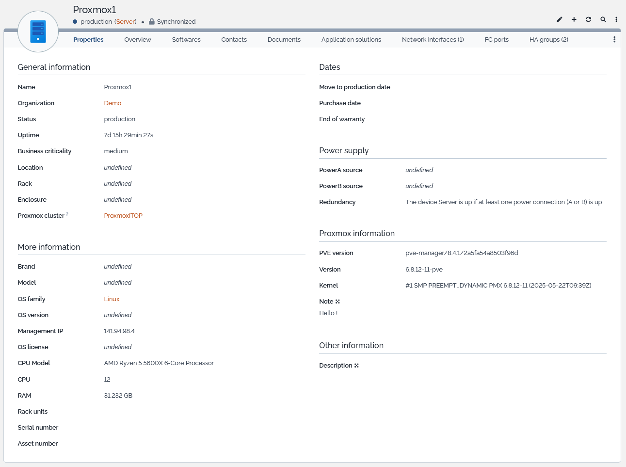 This extension is dedicated to Proxmox, the server virtualization platform that automates the management of virtual machines. It enhances iTop's CMDB by modelizing Proxmox elements that are not part of iTop's default CIs (Clusters, Storage, Containers…) and by adding attributes to some of the existing devices (Servers, Virtual Machines). Combined with the Data collector for Proxmox, it allows Proxmox administrators to fetch in iTop the key elements of their Proxmox infrastructure.