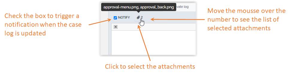 For instance if you modify a User Request, a small check box and paper clip icon appear on top of the public log to define if the public log update should trigger the notification or not: