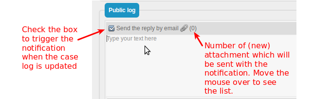 For instance if you modify a User Request, a small check box and paper clip icon appear on top of the public log to define if the public log update should trigger the notification or not: