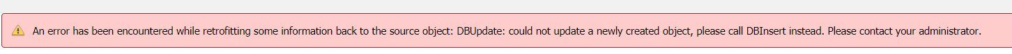 When a retrofit action is wrong, the retrofit is stopped at that point, the operation completes (object created as expected) and the report contains: âAn error has been encountered while retrofitting some information back to the source object: <error message>. Please contact your administrator.â