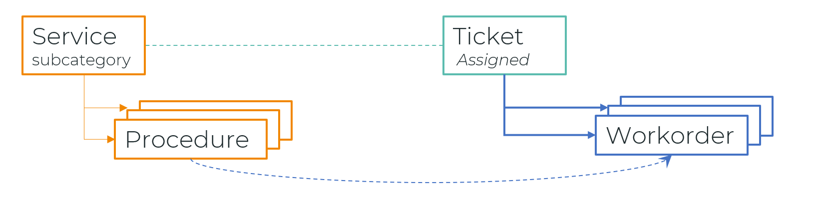 For each Procedure defined on the Service Subcategory a WorkOrder is created, with the same name, description and assigned team.