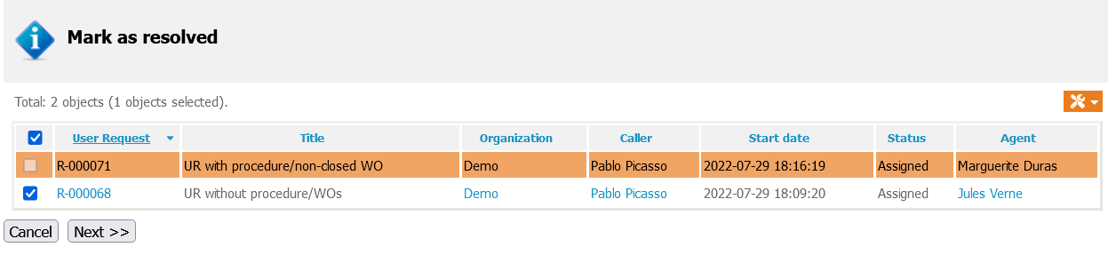 Then in the second screen of the bulk transition, iTop controls for each Ticket if the transition is allowed. If not the Ticket is displayed and automatically unselected and greyed.