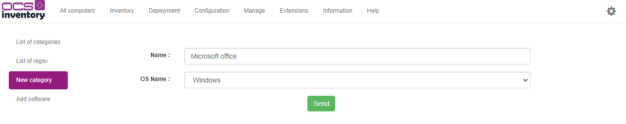 First configure software categories in OCS thanks to Software Category menu below Manage
