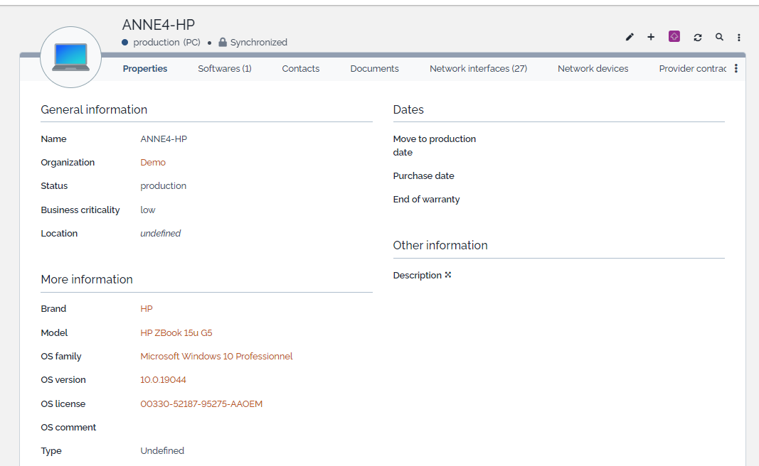 It is necessary to install the small extension Data model for OCS Inventory which adds some fields and an “OCS Inventory” link on synchronized PCs, Servers, Virtual Machines, Mobile Phones and software. This link opens a new tab with the OCS page of the device.