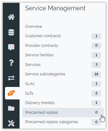 Use the menus under “Service Management” to create and maintain your precanned replies and their categories: