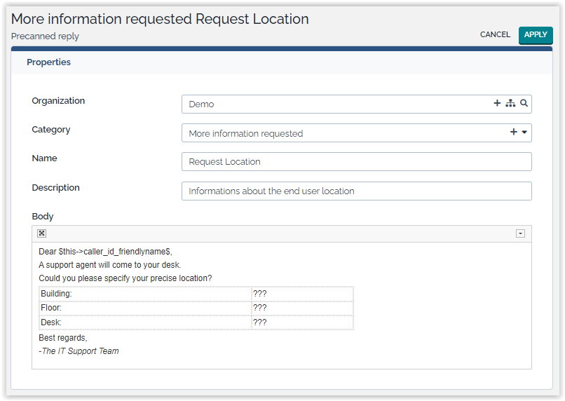 The “Body” field contains the text that will be added into the case log of the ticket when using this precanned replies. If you have configured the attachments to allow them on Precanned Replies, you can add attachments to the Precanned Reply using the “Attachments” tab.