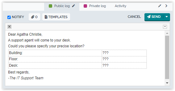 - Pick common answers from a list of predefined replies grouped by categories to update tickets log