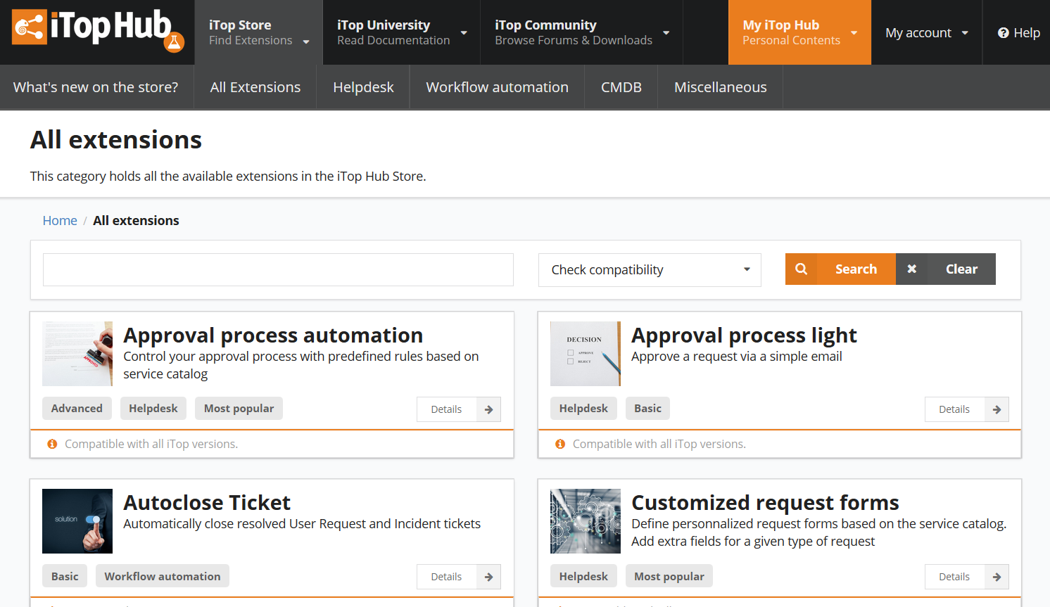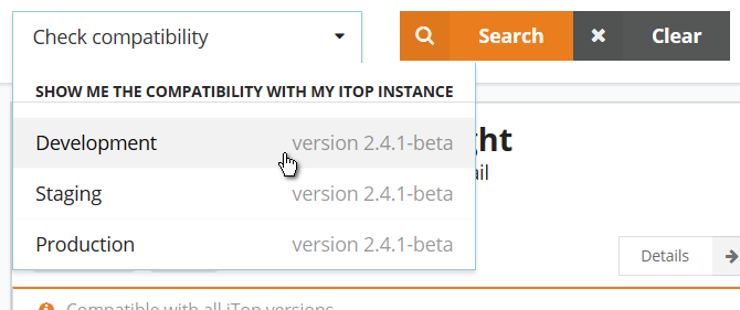 If you have registered at least one iTop instance into iTop Hub, and if you are logged in, a filter is proposed on the extension listing and the detail page of an extension. This filter let you choose between your iTop instances, so iTop Hub can highlight which extensions/versions are compatible with your selected instance based on its iTop version.