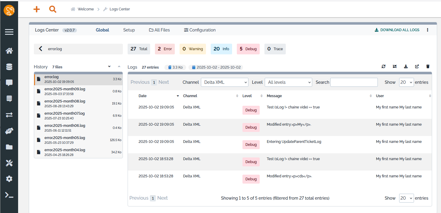 In addition to the files, in case of uncatched Exceptions, iTop can write logs into the EventIssue class. You can access them using this query: SELECT EventIssue in the “Run Queries” menu.