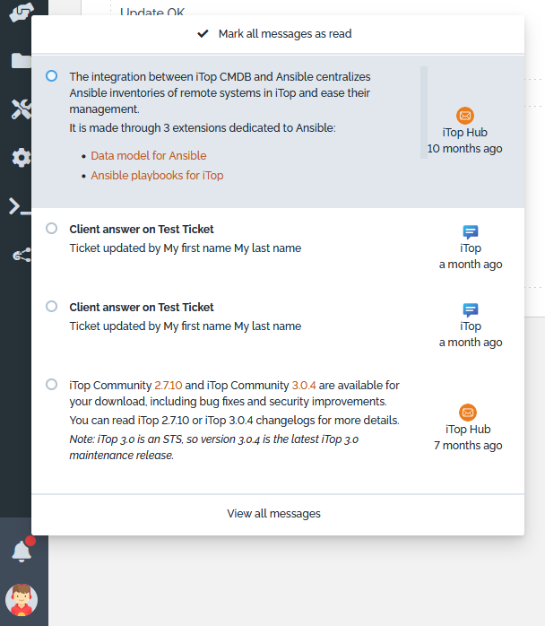 iTop Community Administrators will receive news from 2 different News publisher. The label below the right icon of each message, provides the origin of the message (iTop Hub, iTop or other News publisher).